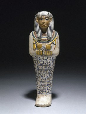 A taste for richly decorated objects developed during the time of Amunhotep III, both in statuary and in the personal arts such as pottery and jewelry. This funerary figure, or shawabti, is decorated vividly with paste inlays in six different colors, conveying a sense of opulence and excess not found in shawabtis from any other reign. Despite the costliness of such a piece, its owner, a woman named Sati, was neither royalty nor a high-ranking official; her title simply means "mistress of the house."