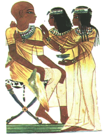 Os donos da casa — nos conta o egiptólogo Pierre Montet — sentavam-se em cadeiras de espaldar alto, cujas partes de madeira eram incrustadas de ouro e prata, turquesa, cornalina e lápis-lazúli. À disposição de alguns convidados colocam-se também assentos muito luxuosos. Os outros contentavam-se com tamboretes em X ou mesmo com tamboretes de pés verticais. Em casa das pessoas humildes, as