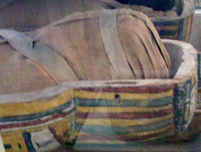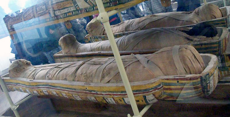 Na foto do alto da página, múmias de três irmãs que viveram na XXII (c. 945 a 712 a.C.) ou XXIII (c. 828 a 712 a.C.) dinastias. Na outra foto, detalhe de uma destas múmias. Ataúdes e múmias originárias de Tebas. Madeira e material orgânico. Expostas no Museu Egípcio de Turim. Fotos exclusivas © Roseli M. Comíssoli de Sá