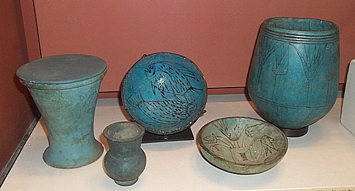 Vaso com tampa e vaso menor fabricados com azul egípcio; as demais peças são de faiança siliciosa.