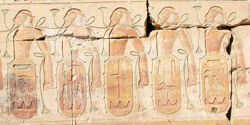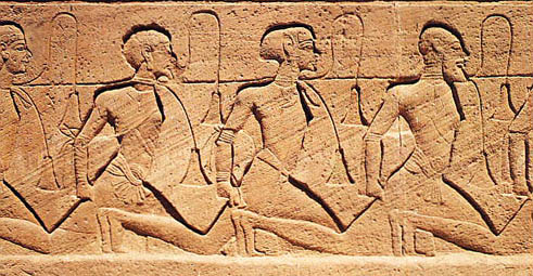 Prisioneiros de guerra aparecem muitas vezes retratados em cenas nas quais o faraó massacra seus inimigos. Isso, entretanto, é mais uma expressão simbólica do triunfo do rei sobre as forças do caos e o restabelecimento da ordem do que uma realidade. Na verdade, no antigo Egito os prisioneiros de guerra sempre exerceram importante papel como mão-de-obra. O desenvolvimento do Estado e o aumento da burocracia administrativa, as construções monumentais e a colonização do país criaram uma necessidade de mão-de-obra que não podia ser satisfeita e que se transformou, no início do Império Antigo (c. 2575 a 2134 a.C.), num problema considerável. Desde cedo surgiu, então, a idéia de se empregar como mão-de-obra os prisioneiros das campanhas militares na Núbia e até mesmo de se organizar razias com objetivo específico de capturar mão-de-obra complementar. Na ilustração acima, do templo de Abu Simbel, estão representados negros e asiáticos prisioneiros de Ramsés II. Na foto abaixo, de um relevo do templo do mesmo faraó em Abido, prisioneiros são mostrados acima dos nomes das respectivas localidades capturadas.
