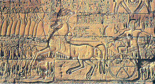 Ramsés II (c. 1290 a 1224 a. C.) foi outro faraó que cantou seus feitos guerreiros. Em seus templos exaltou suas façanhas no decorrer da batalha de Kadesh, embora essa luta, de resultado indeciso, só tenha tido sabor de vitória porque o rei dela escapou com vida. Ele registrou o fato em muitos relevos, não apenas em seu templo funerário em Tebas, mas também em Luxor, Carnaque, Abido e Abu Simbel.
