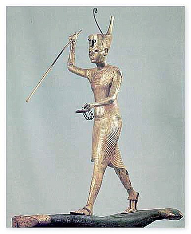 No alto desta página vemos uma escultura em madeira sobre a qual foram passadas camadas de gesso e ouro. Ela representa Tutankhamon (c. 1333 a 1323 a.C.) com um arpão na mão direita e uma corda na esquerda. Simbolicamente, o que o rei caça é o hipopótamo, animal sagrado do deus Seth.