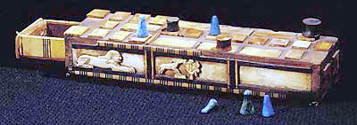Além das atividades esportivas, uma outra série de jogos apelava mais para a sorte do que para a inteligência. Nessa categoria enquadram-se diversos jogos de mesa como, por exemplo, o cobra circular ou o jogo do escudo. Esse tipo de jogo aparece documentado desde os tempos pré-históricos e sua função não era meramente lúdica. Tinham importante papel a cumprir na vida futura e, por isso, aparecem frequentemente entre os objetos funerários. A viagem subterrânea dos mortos era comparada à viagem sobre o tabuleiro. Diversas casas representavam os perigos encontrados nessa jornada. O jogo de mesa favorito era, sem dúvida, aquele conhecido com o nome de senet, no qual o tabuleiro é formado por três fileiras de dez casas cada uma. Cinco dentre elas estão marcadas com caracteres cujos valores numéricos podem ter um significado tanto positivo quanto negativo. Os peões, entre cinco a sete, eram movimentados segundo as indicações dos objetos que serviam como dados. Na foto acima um tabuleiro de senet feito com ébano, marfim e faiança e datado da XVII dinastia (c. 1640 a 1550 a.C.).